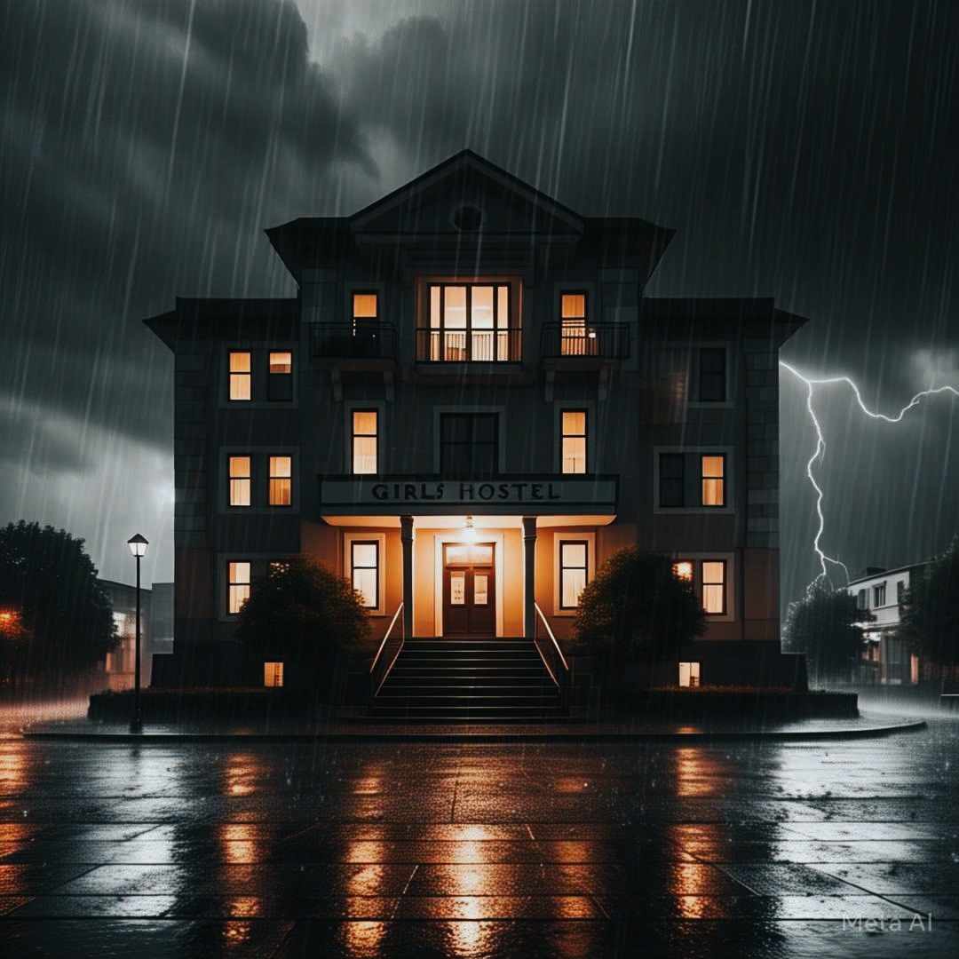 ["The picture shows the hostel on a stormy rainy night, with shadows dancing on the walls and darkness looming large."]